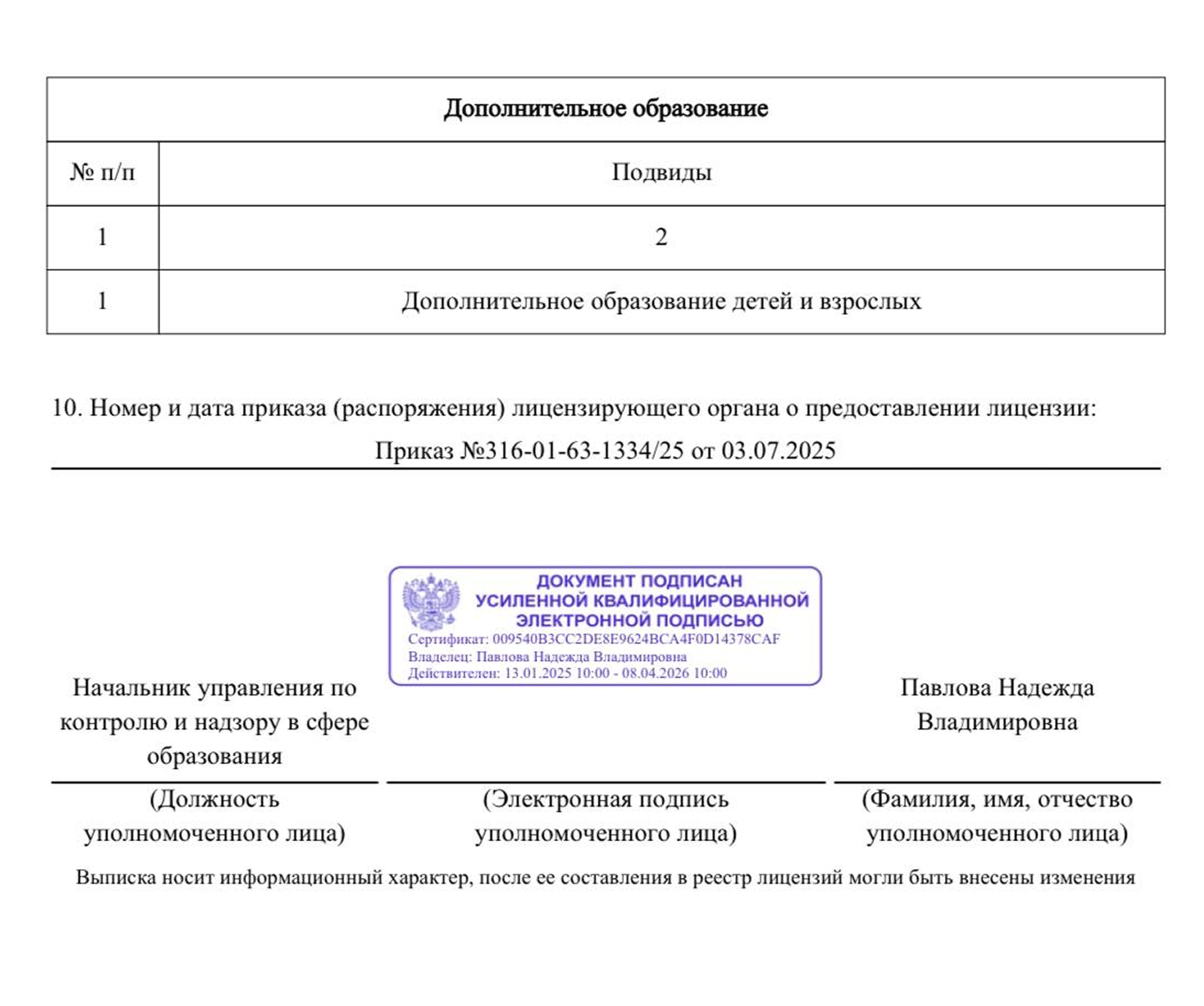 2.5. Исполнитель оказывает образовательные услуги на основании Лицензии № Л035-01281-52/02584121 от 03.07.2025 и вправе выдавать при успешном освоении программы Сертификат об успешном освоении программы.